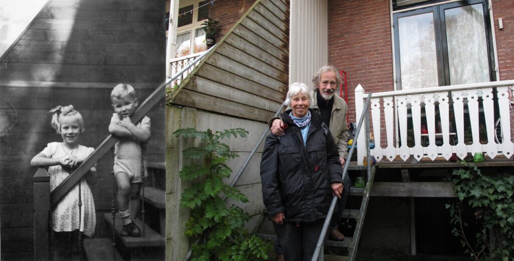 Herman is met zijn zus Margo in 2011 teruggegaan en samen hebben ze de foto uit 1945 achter op de trap naar de tuin van JdW4, gemaakt bij het 40-jarig huwelijksfeest van opa en oma, nog eens overgedaan.